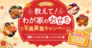 今年も「教えて!わが家のおせち 写真募集キャンペーン」を開催いたします!ご応募いただいた方の中から抽選で 総計220名様に素敵な賞品 が当たります。 応募方法は Webフォーム・X(旧Twitter)・Instagram